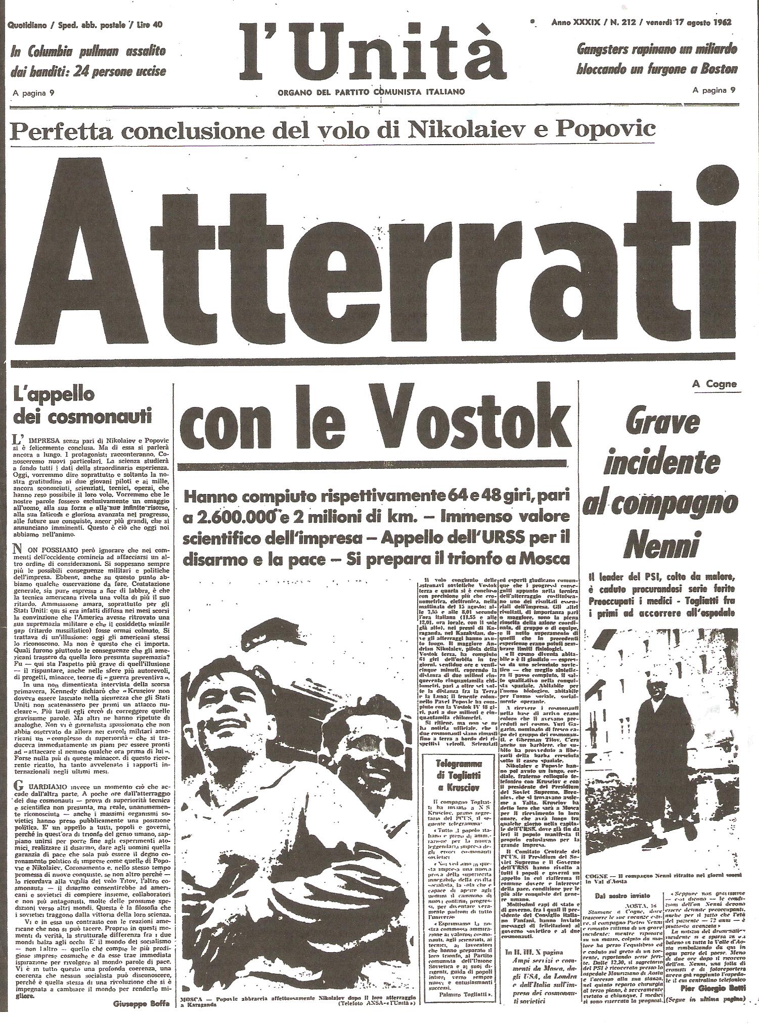L’Unione Sovietica fa rientrare sulla Terra, a distanza di pochi minuti l'uno dall'altro (alle 6:52 UTC e alle 6:59 UTC, rispettivamente), i cosmonauti Nikolayev sulla Vostok 3 e Popovich a bordo della Vostok 4. I due uomini hanno realizzato il primo “appuntamento spaziale”, raggiungendo una distanza minima di cinque km.